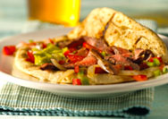 Tuck steak and vegetables into warm pitas and top with some salsa.