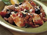 3. Stir ravioli, spinach and olives into beef mixture; heat through. Top each serving with some crumbled or grated cheese before serving.
