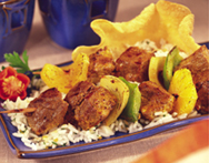 2. Place the beef cubes into the remaining yogurt mixture, stir and refrigerate for 10 minutes. Thread the steak, green pepper, onion quarters and orange slices alternately onto skewers.